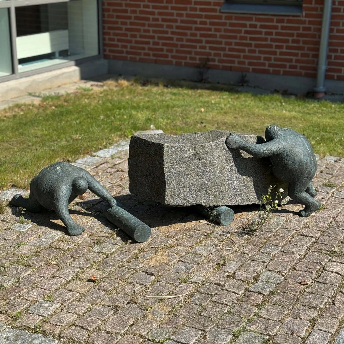 Skulpturen er et fint eksempel på kunstnerens finurlige og humoristiske formsprog, hvor små, tykke mænd optimistisk forsøger at løse uløselige opgaver.
