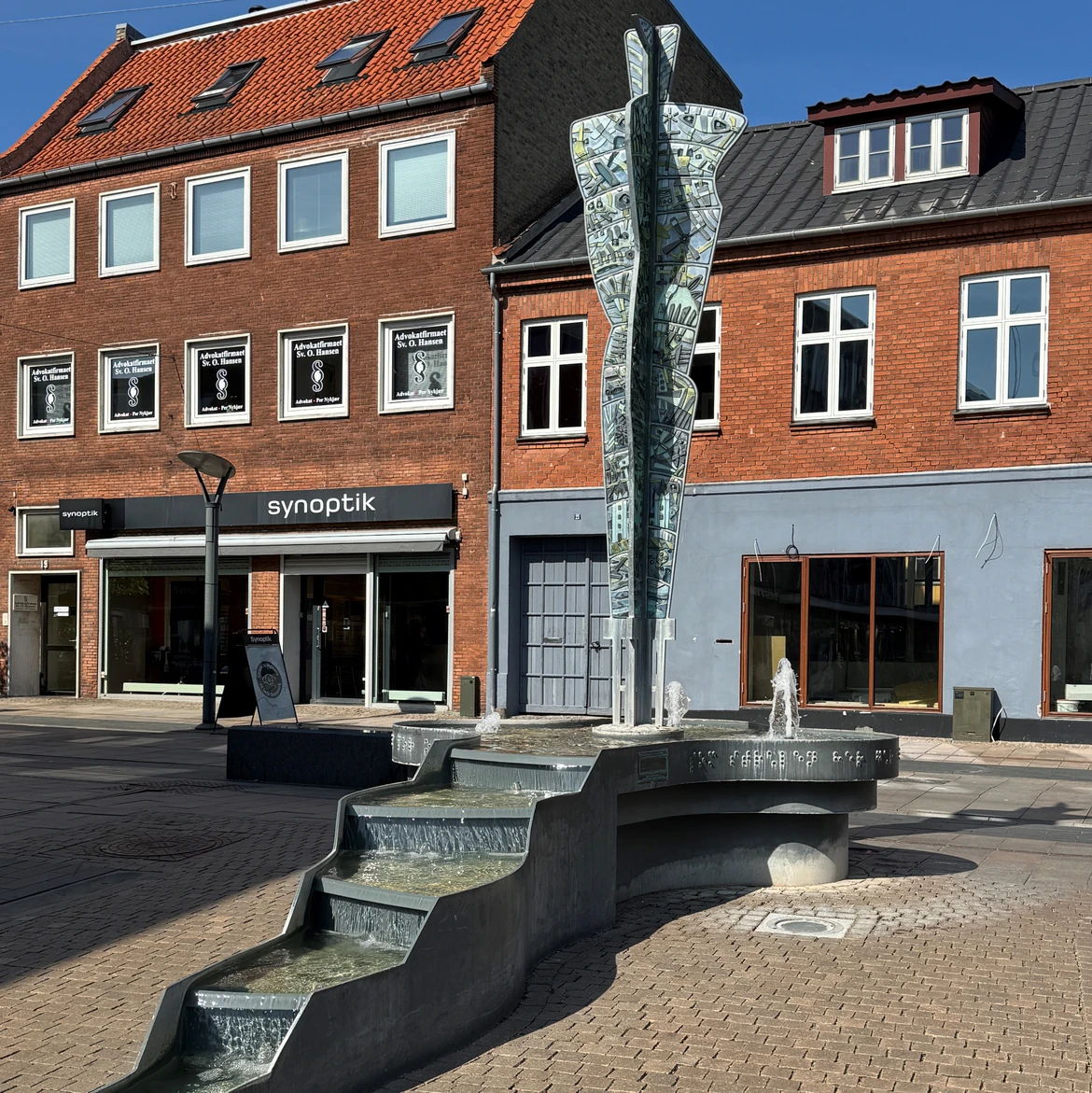 Vandkunsten er udført af glaskunstnerne Britta Madsen (født 1948) og hendes mand Søren Gøttrup (født 1948), Støvring. Værket består af bassin, vandtrappe og skulptur. Fra foden af vandtrappen fortsætter vandet i et smalt spor i fortovsbelægningen mod syd i Vænget.