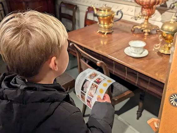 Gå på opdagelse i museets udstillinger og find tingene, der passer til billederne på spillepladen. Når I finder de rigtige genstande, kan I klippe i cirklerne og til sidst hente en lille præmie i museumsbutikken. En hyggelig og aktiv måde for børn fra 4-12 år og deres familier at opleve museet sammen.