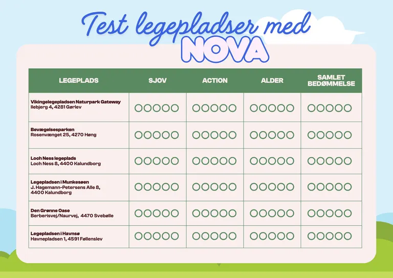 Nova tester ikke kun, hvor sjov legepladsen er. Hun tjekker også, hvor meget action der er. Om udfordringerne passer til forskellige aldre. Og om den er for vild - eller måske faktisk passer bedre til lillesøster Saga på 6 år. Hver legeplads får hendes umiddelbare dom og anbefaling. Følg med, når Nova svinger, klatrer, rutsjer og tester - og få et ærligt indblik i, hvilke legepladser der er et must-visit, når du vil lege løs i Kalundborg.